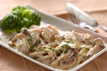(1)のフライパンにサラダ油を中火で熱し、シメジ、マッシュルーム、玉ネギを焼き色がつくまで焼き、分量外の塩コショウを振る。(2)の<クリームソース>を加え、混ぜる。
