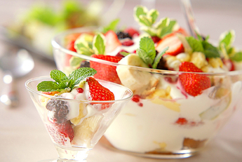 残り半量のスポンジケーキとフルーツも同じように入れ、ミントの葉を飾ってできあがり! スプーンでざっくり取り分けてどうぞ。