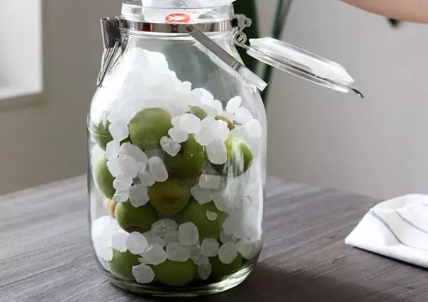 保存瓶に梅と氷砂糖を交互にいれていきます。