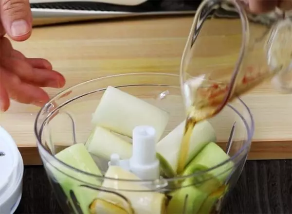 ネギは8等分にカットします。ニンニクひとかけと、調味料類を「ぶんぶんチョッパー」に全て入れます。