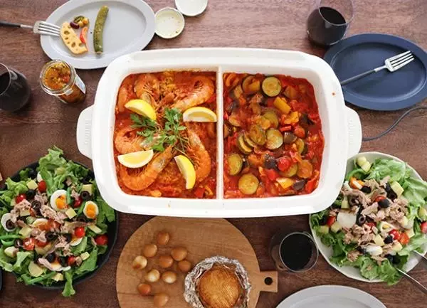 オプションの仕切り鍋は、ふたつの味の鍋が楽しめることで人気ですが、今回はラタトューユ&パエリアを同時に作るのに使用しました。