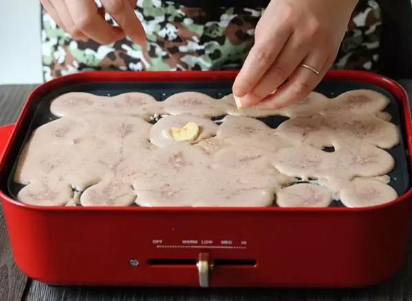 熱したたこ焼きプレートにバター(分量外)をひいて、生地を流し込みます。