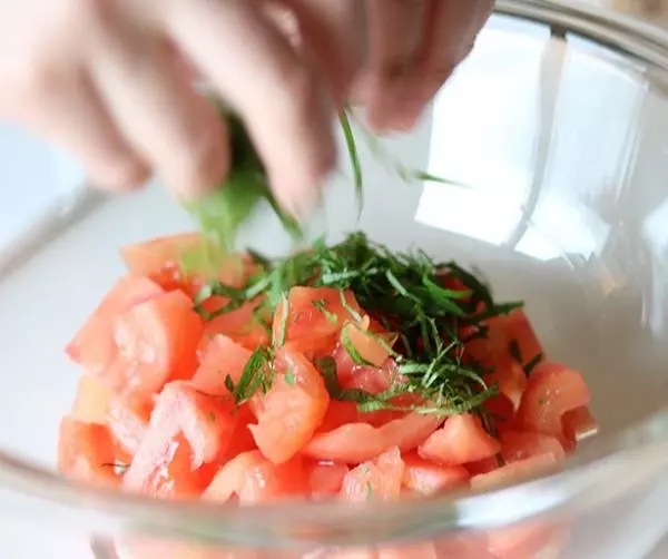 皮むきしたトマト2個を一口大にカットし、大葉を千切りにします。