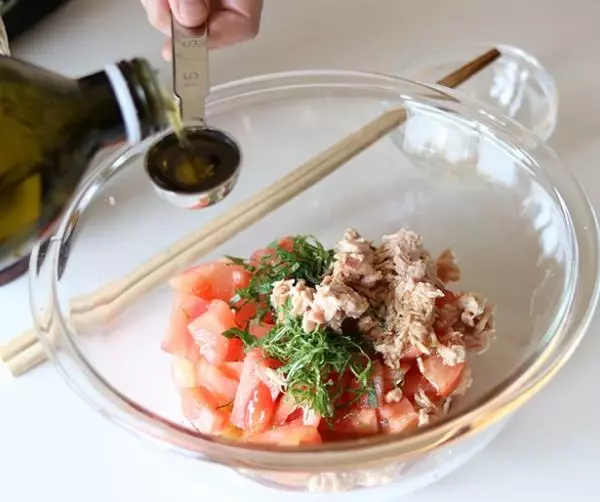 ボウルにトマト、大葉、ツナ缶(1個)、オリーブオイル(大さじ2)、ポン酢(大さじ1)を入れて混ぜあわせます。