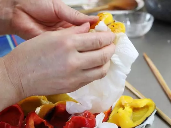 濡らしたクッキングペーパーを使いながら、熱いうちに皮をむいていきます。