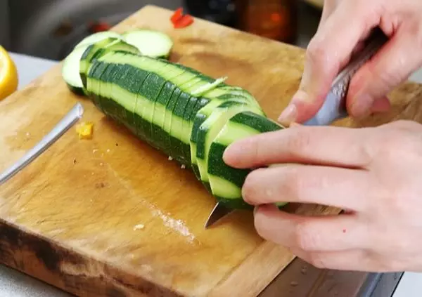 ズッキーニの皮を縞模様になるようにスライスし、5mm幅ぐらいにスライスします。