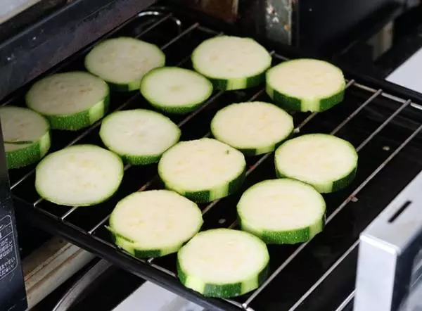 ズッキーニ、カットしたパプリカをグリラーに交互に並べ、マリネ液をまわしかけます。