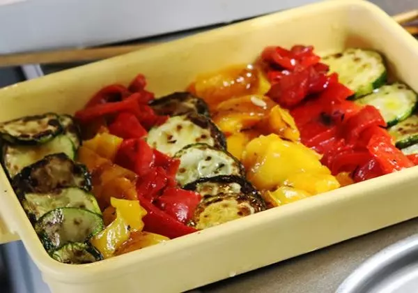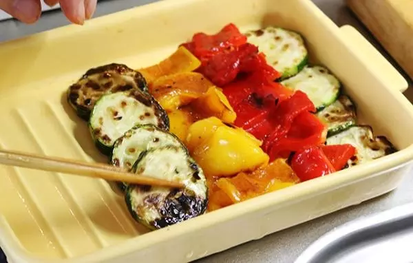 グリラーはオーブン料理用に作られていますが、蓋があって薄いので、冷蔵庫で冷やしたり寝かしたりする前菜にも向いています。特に黄色のグリラーは夏野菜のカラーとも相性抜群。