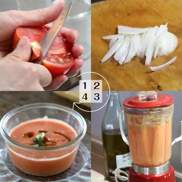 ブレンダーに、トマト、オリーブオイル、塩を入れ、撹拌します。味をみて塩の量を調整し、玉ねぎも入れてさらに撹拌します。