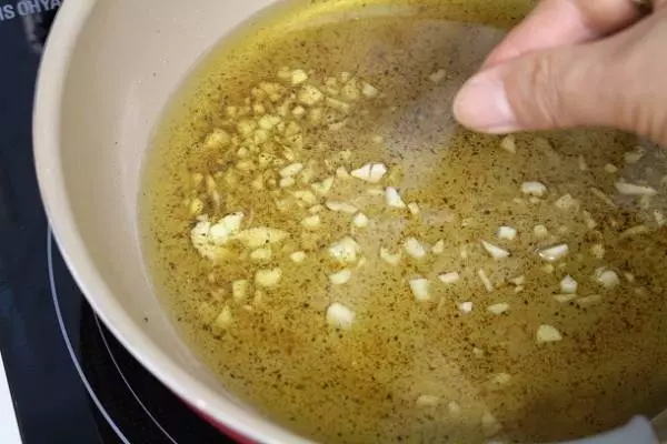 オリーブオイルを弱火であたためて、そこにガラムマサラとみじん切りにしたにんにくを入れます。