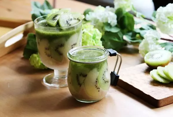 グラスに1/2にカットしたキウイを貼り付けておきます。