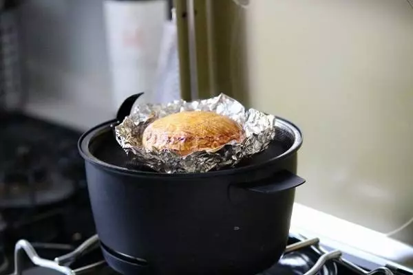 【2】チップ皿にスモークチップを大さじ1.5入れ、本体にセットします。蓋をして、上部の穴を半開にして、強火で加熱します。煙が出てきたら、網の上にアルミホイルを敷いてチーズを上に乗せ、中弱火で約10分燻製します。