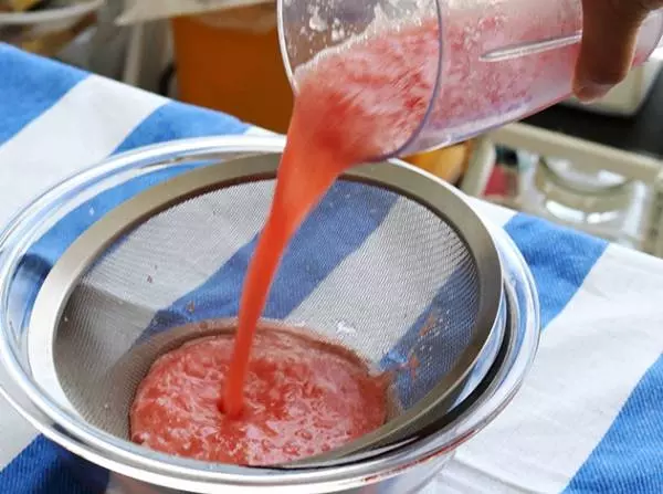 残りのスイカの種をとって、ジューサーにかけてざるで濾します。スイカ液は700cc分用意します。(足りなければ水を加えて量を調整します)