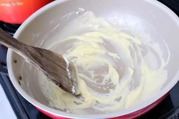 牛乳200mlを少しづづ加え、ダマにならないよう混ぜ続けます。とろみがついてきたら出来上がりです。