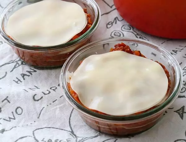 耐熱容器にミートソース、ホワイトソースを順番に重ねます。