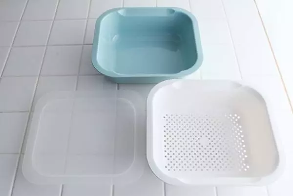 バッド、蓋、ザルの3つがセットになったコランダー。