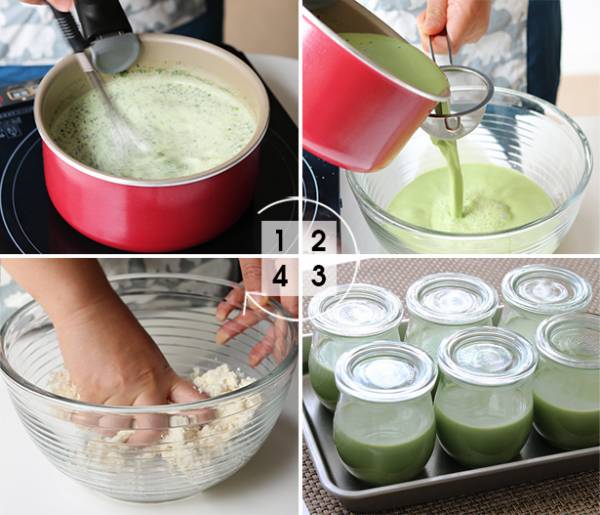 生クリーム、牛乳、砂糖、抹茶パウダー、ゼラチンパウダーを沸騰させないように火にかけ、溶けるまでよく混ぜます。