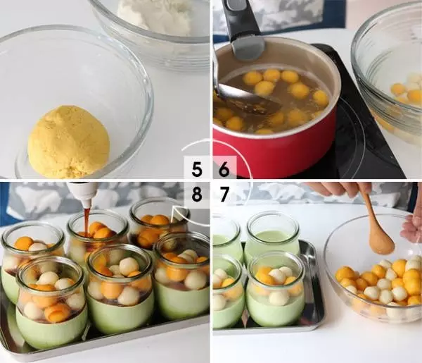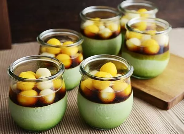 冷やし固まった抹茶プリンに白玉をバランスよく乗せていきます。【8】