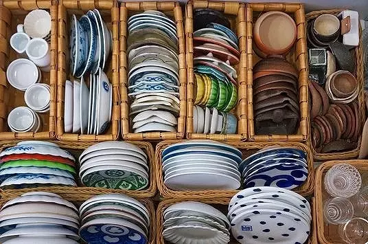 「豆皿は小さなカゴなどに入れて、プレート類は縦収納にしています。