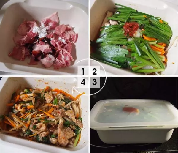 肉、もやし、その他の野菜を入れて、すりごま以外の調味料を回し入れます。【3】