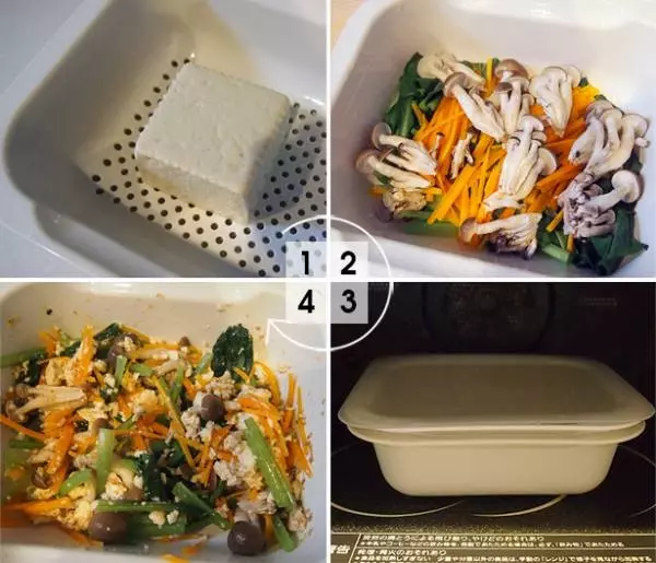 人参は千切り、小松菜は、1口大にカットします。しめじはほぐして、全てを耐熱容器に入れます。