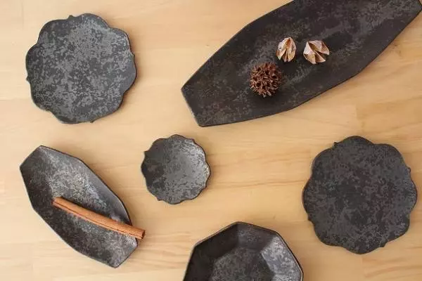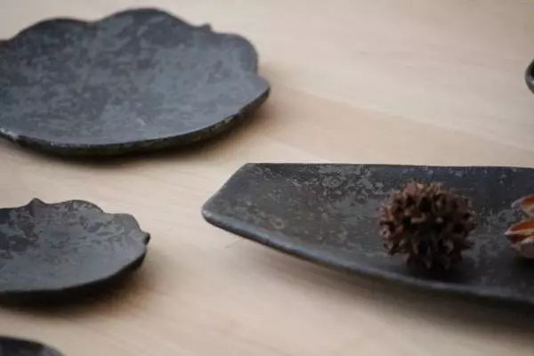 佇まいにどこか品の漂う安福さんのうつわたち。時を重ねた金属のような表情を持つそのうつわたちは、ひとさらひとさらがとても力強いのに、料理を引き立てるたおやかさも持ち合わせます。