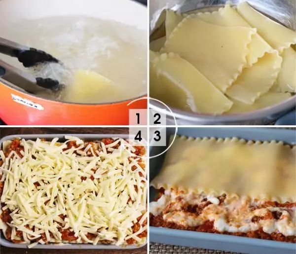 ラザニアを表示時間(約4分間)どおりにゆでます。オリーブオイルを入れて、混ぜるとくっつきにくくなります。