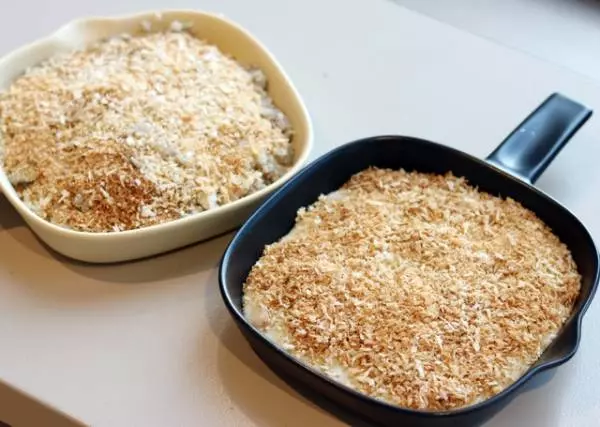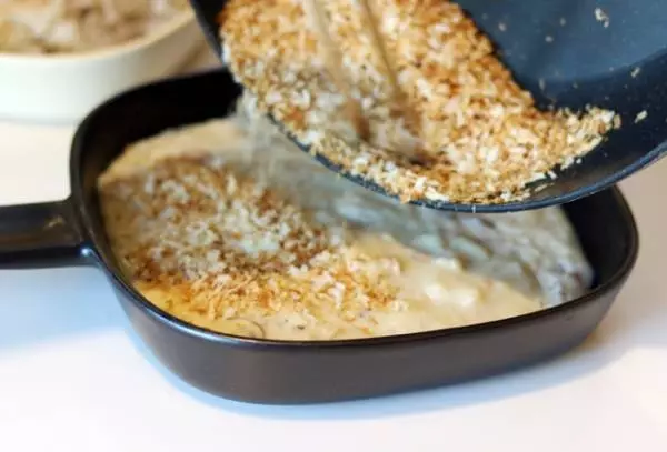 器にソースを入れ、上に乾煎りしたパン粉をかけます。その上にオリーブオイルを回しかけ、トースターで軽く焼色がつくまで(5〜10分)焼きます。