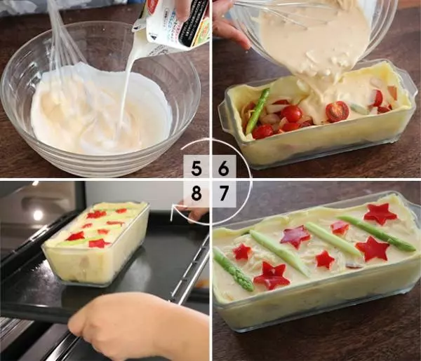 炒めた具材、カットしたミニトマトを型にバランスよく入れ、5の卵液を流し入れます。
