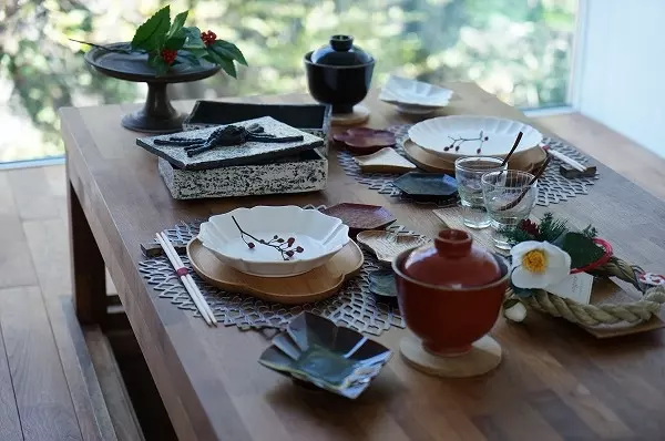 黒いうつわと白い磁器を組み合わせてきりっとした印象に。背筋を伸ばして1年が始まります。