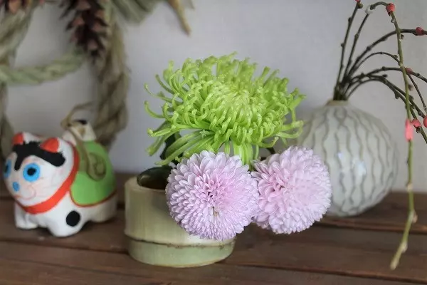 こちらも築地の戦利品。お正月らしいミニアレンジメントの花器として大活躍してくれたのは、道具屋さんで購入したなんと150円の竹のぐい呑み。
