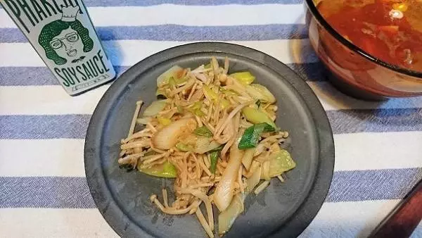 パクチー醤油には、ごま油やニンニクも入っています。だから、ネギにエノキにもやし・・・といった冷蔵庫の余りものも切ってパクチー醤油で炒めるだけで、白いごはんの立派なおともになりますよ。