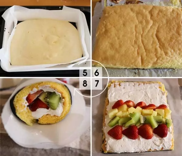 手前の方が厚くなるように生クリームを塗ります。苺やお好みのフルーツを並べます。