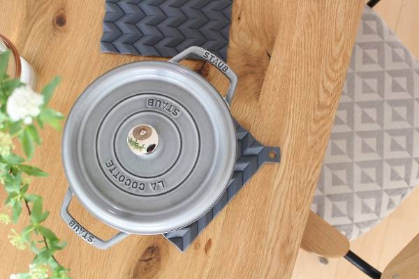 柔らかでいて耐熱性もあるシリコン製ポットホルダー(鍋つかみ)は、鍋つかみとしてはもちろんのこと、鍋敷きとしても使用可能なアイテム。でこぼこと影を生み出すその表面の表情が、いつもの食卓にアクセントを加えます。