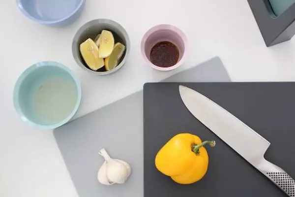 異なる3カラーの薄いチョッピングボード(まな板)が1つのスタンドにまとめられた、まな板セット。お肉用、野菜用・・・と色ごとに使い分けられるのが魅力です。