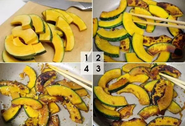 フライパンに油を入れて熱し、かぼちゃを両面よく炒めます。