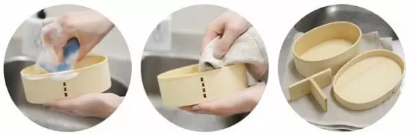 白木(無塗装)の曲げわっぱは、洗い方や乾燥にとても気を使いますが、こちらはお手入れがしやすいように塗装を施してあります。いつものお手入れは、中性洗剤で洗って乾いた布でしっかり拭き乾かすだけでOK、イージーケアなところも優秀です。