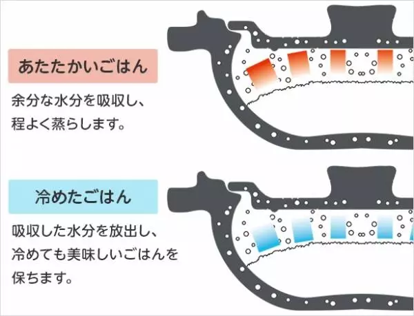 炊飯後は木のおひつと同様に余分な水分を吸い、ご飯がべとつくことがありません。