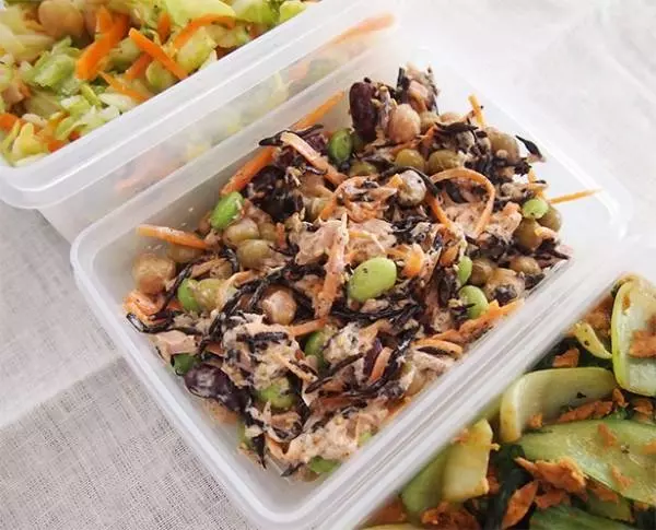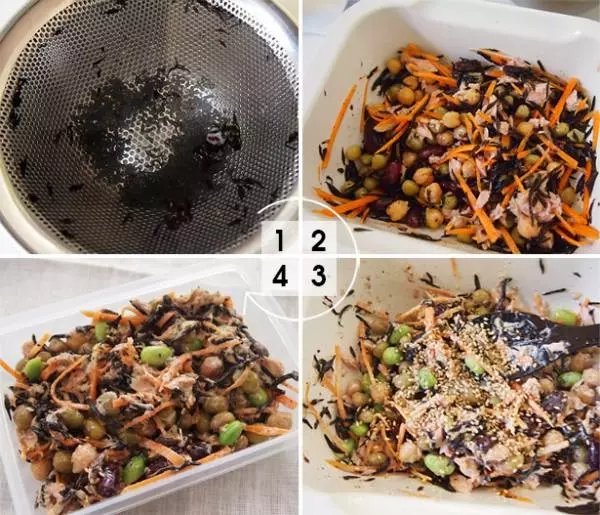 水で戻した芽ヒジキ、ミックスビーンズ、ツナ缶とあえていきます。【3】