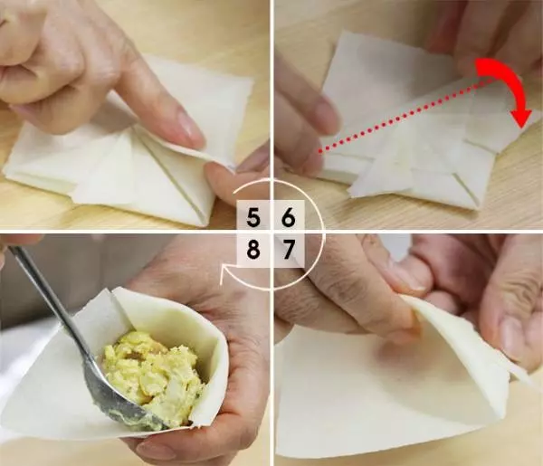 手前の皮1枚を写真のように上に折り返し、水溶き薄力粉で張り合わせます。
