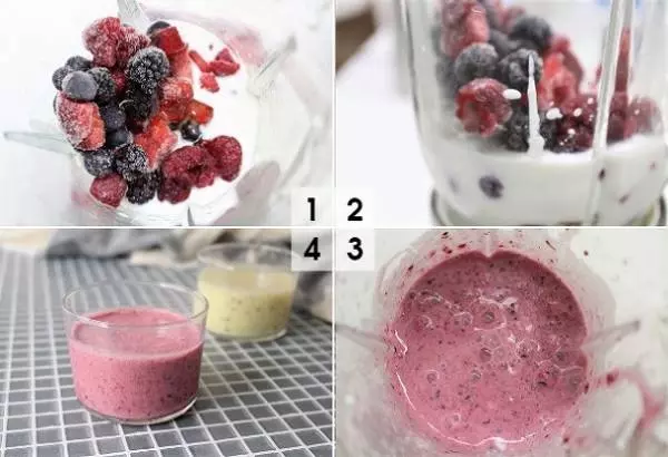 < ベリーベリーヨーグルトスムージー >※1人分スーパーなどで簡単に手に入れることができる冷凍ベリーは、氷の役目も果たしてくれる材料。