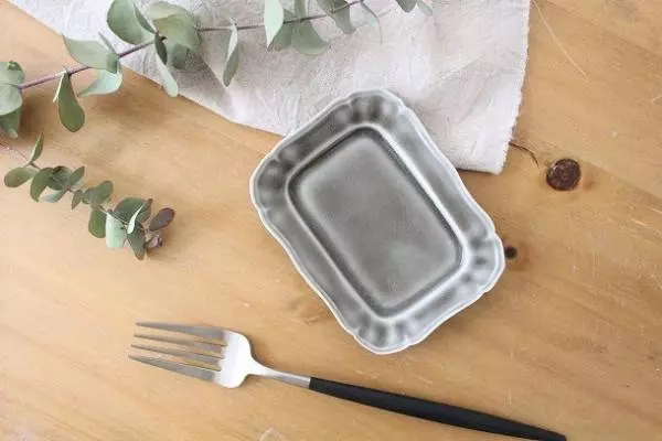 アンティークのピューター皿のような線を持ちながらどこかすっきりとした佇まいの「花形リムまめ皿スクエア」。ひとさらの中で移りゆくグレーの色合いが、眺めていて楽しい阿部さんのうつわです。