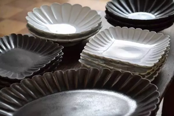 松尾さんの輪花のうつわたちがどこかスタイリッシュに瞳に映りこむのは、きっと、そのふたつの色のせい。