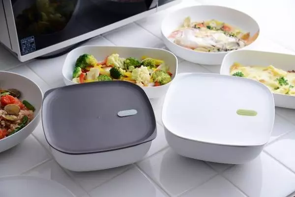 見た目はまるでメラミン食器のような、しっかりとしたスチロール樹脂製の器。電子レンジもオーブンにも対応して、蒸す・煮る・茹でる・炊く・焼く・冷凍保存まで、たったひとつで片付く万能っぷり!レンジやオーブンから出したら、食器としてサーブまでそのままできてしまう、究極の時短調理器具なんです。