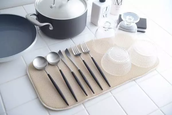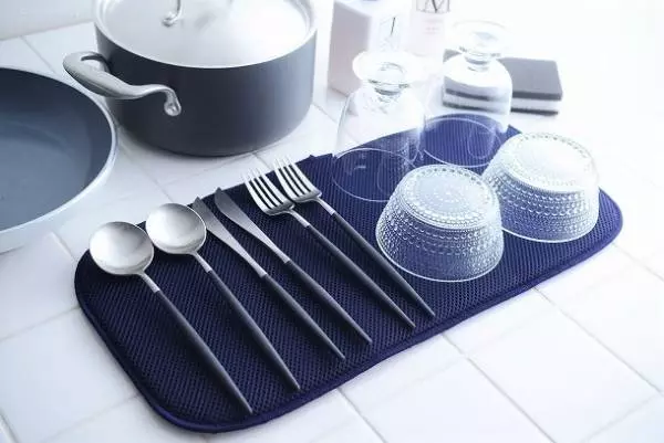 メッシュ×マイクロファイバーのリバーシブル仕様の高吸水マットを広げれば、即席の水切りスペースが出来上がります。
