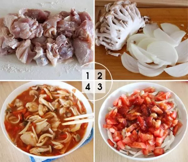 トマトはさいの目切り。玉ねぎは薄切り、しめじは石づきをカットし、にんにくはみじん切りにしておきます。