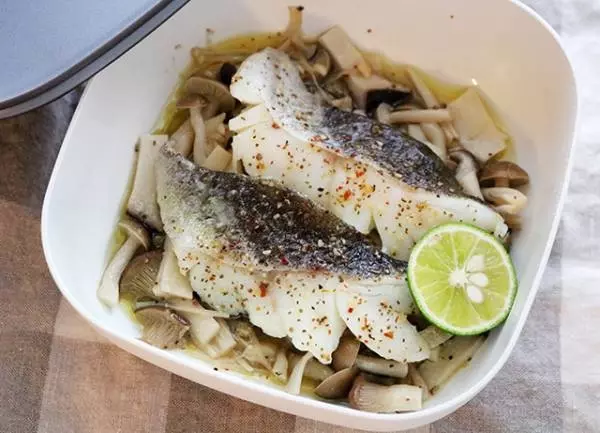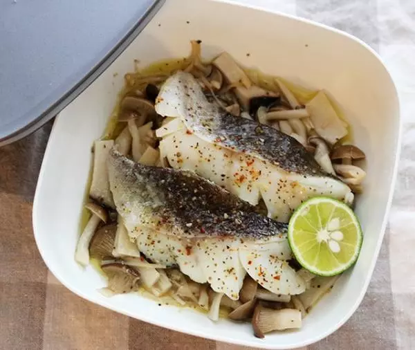 クッキングディッシュにキノコを並べ、その上に白身魚を並べます。