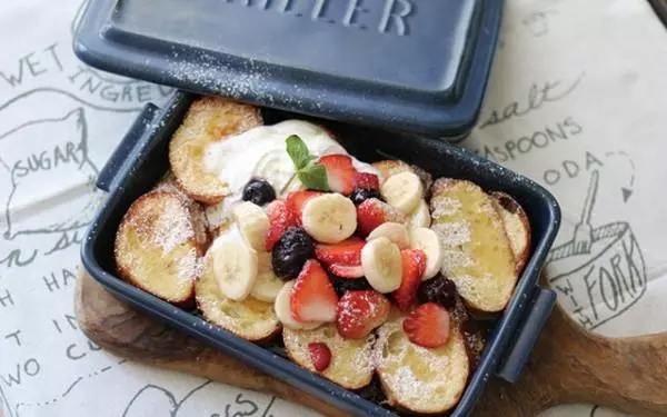 容器で液に浸したらそのまま焼け、テーブルにもサーブできます。トッピングでご馳走風に。