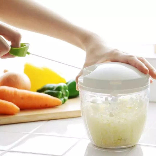 通常サイズの2倍の容量になった、900ccサイズ。電気を使わず、フードプロセッサーのように場所も取らず、野菜のみじん切りが時短で完了します。