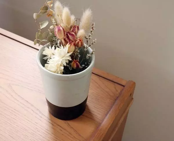 フラワーベースにしたり、ペンスタンドにしたり。本来の使い方ではないものの、インテリアとして違和感がありません。